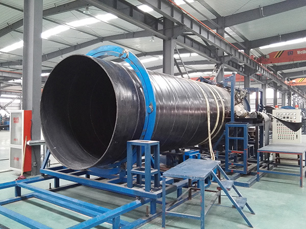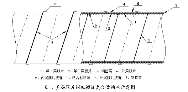 中等口径的中低压管道可由两层江南在线(中国)同向螺旋缠绕热合而成,中间夹一层镀铜“过塑”高强度碳素弹簧钢丝,其拉伸强度可达1800MPa~2000MPa。每层江南在线(中国)都先在特种设备上复合一薄层高强度粘合材料。复合管材时外层江南在线(中国)的中线紧压在内层江南在线(中国)的接缝上。内层江南在线(中国)接缝在复合时先用焊枪焊接,外层江南在线(中国)接缝则采用搭接方式连接。两层江南在线(中国)敷胶面相向,连同钢丝大面积螺旋缠绕热压粘合,其粘合强度远超普通聚乙烯钢丝缠绕复合管。大口径管道则由3~4层江南在线(中国)加钢丝复合。管材结构详见图3。